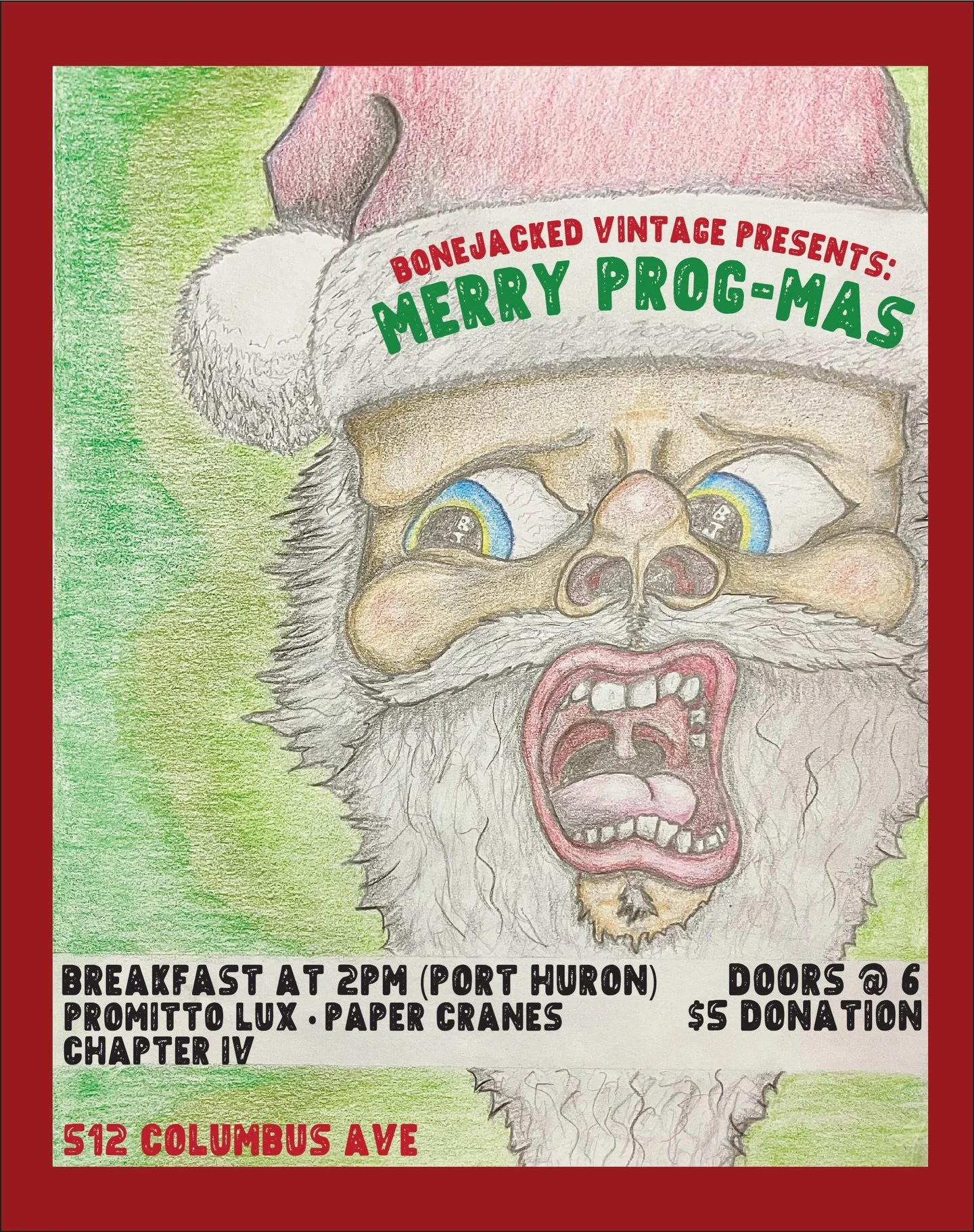 View fullsize We’ve got another holiday banger in the works. Bonejacked brings you Merry Prog-mas with Breakfast At 2pm (Port Huron), Promitto Lux (Bay City), Paper Cranes (Saginaw), and Chapter IV (Essexville). Doors at 6pm, $5 donation at the door goes to