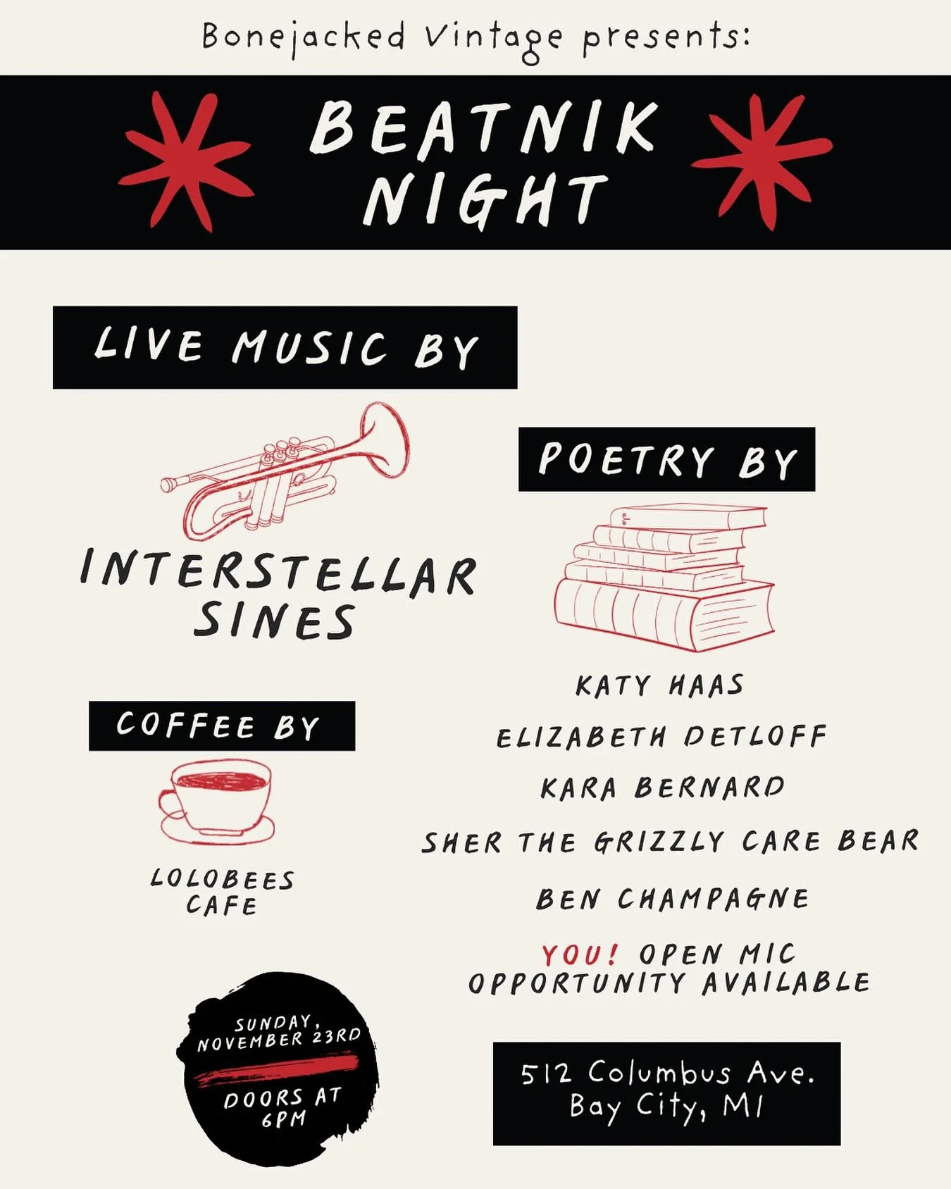 View fullsize We’ve got something real boss coming up, ya cool cats. Come join us for an evening of jazz, poetry, and coffee drinks from @lolobeeslounge. Be here or be the mayor of dullsville, daddy-o.