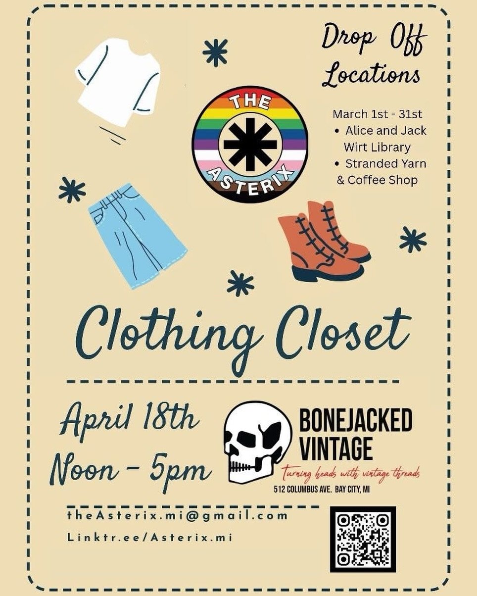 View fullsize Clothing Closet, presented by the Asterix, is a biannual event. Bring in clean gently used clothing to Alice and Jack Wirt Public Library, and Stranded Yarn and Coffee Shop March 1-31st. On April 18th from 12pm-5pm, the Clothing Closet will be availa